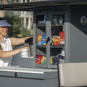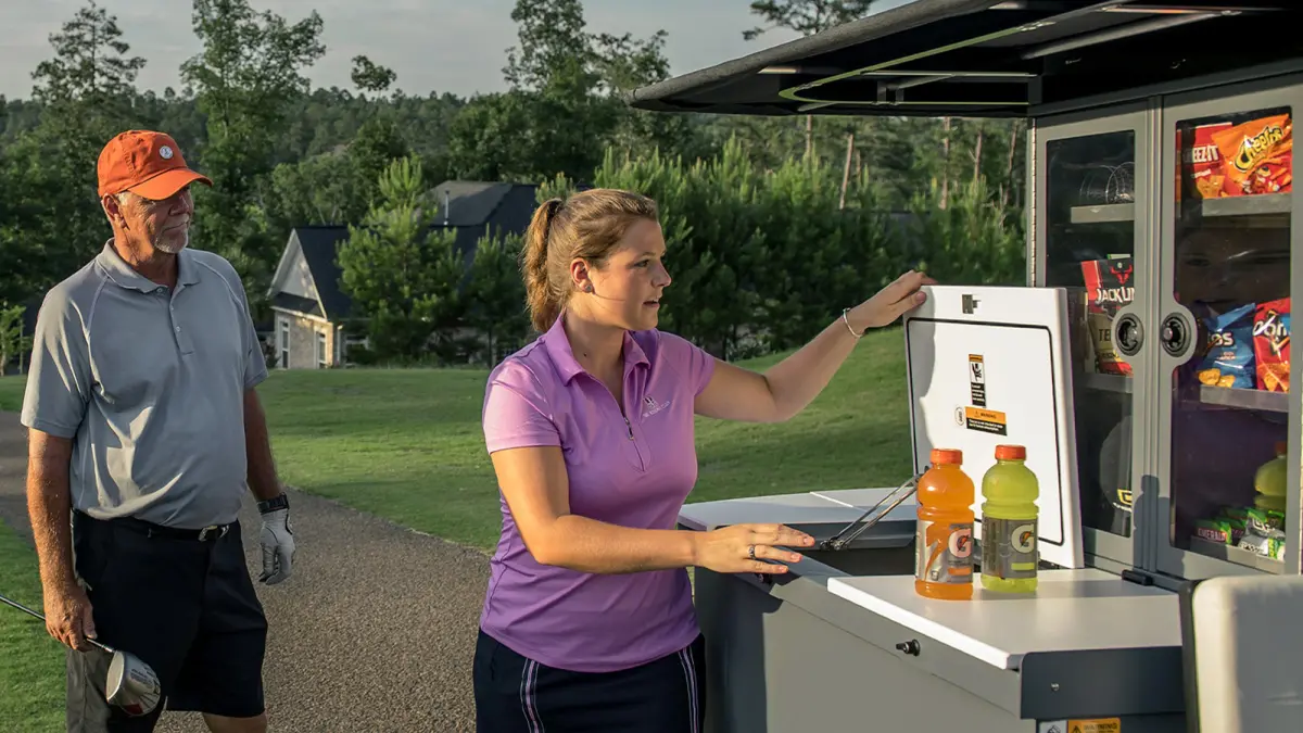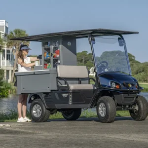 Serve more guests without restocking: the Cushman Refresher Oasis carries 500 cans, 6.7 ft³ of snacks, and a 12.1 ft² wrap‑around counter. Choose silent ELiTE lithium power or a fuel‑efficient 13.5 hp EFI gas engine—both riding on a rugged steel frame with automatic parking brake (ELiTE) and diamond‑plate durability.
